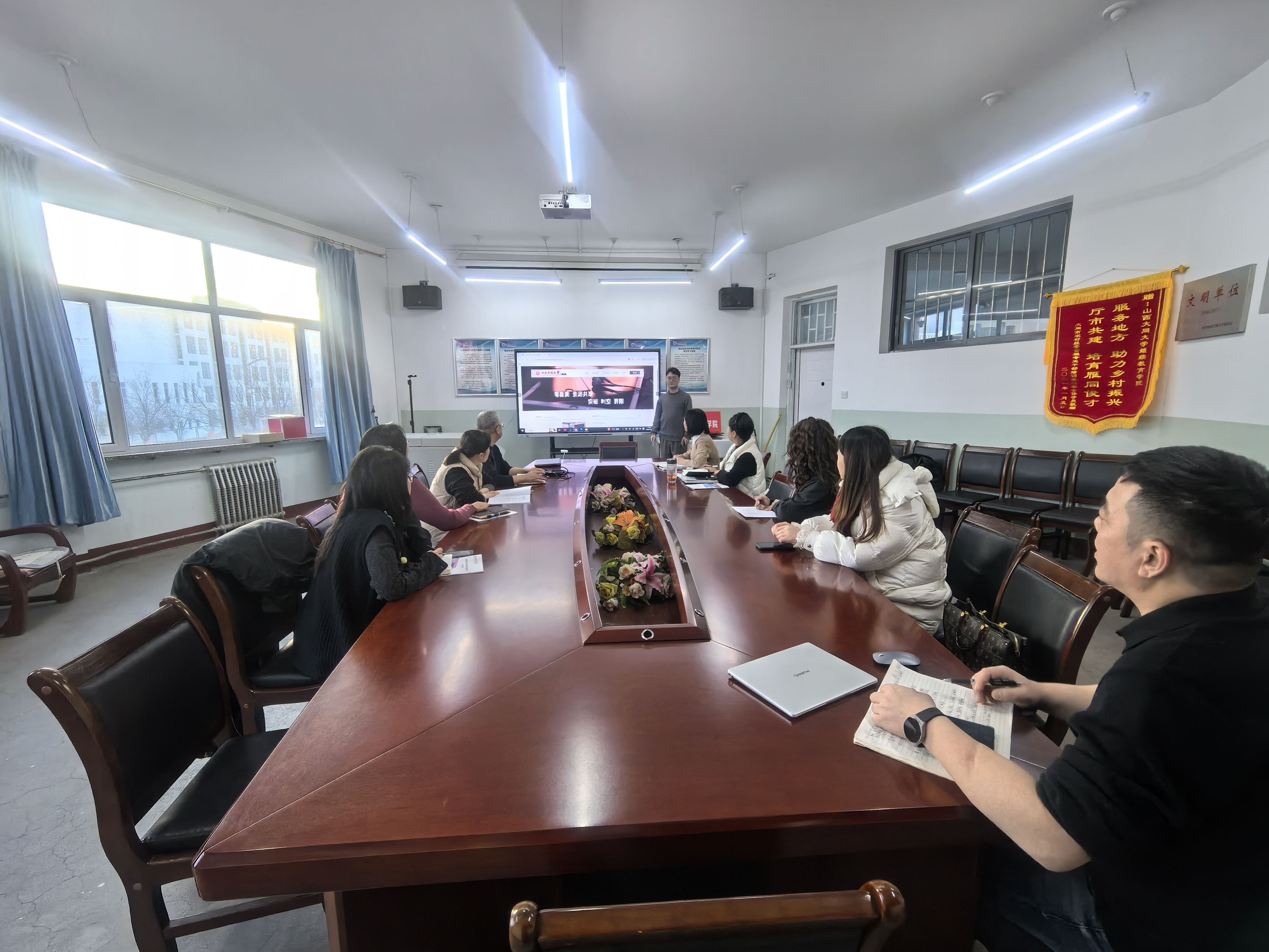 为落实新时代高等学历继续教育改革要求,推进办学管理智慧化,扎实筹备2026级新生教学管理工作,2026年1月19日,山西大同大学继续教育学院在致知楼三层会议室召开网络平台培训暨新生班主任工作部署会议。副院长秦俊丽主持会议,全体2026级新生班主任、教学点及教学管理工作人员参会。 首先开展网络平台操作培训,平台培训人员结合继续教育学情与管理实际,拆解演示线上学籍管理、教学管理、毕业论文、学生管理等教学管理平台核心模块,确保精准掌握学籍动态和学情监测,提升数字化管理能力。参训人员现场互动答疑,有效提升操作熟练度,为高效开展教学管理筑牢基础。